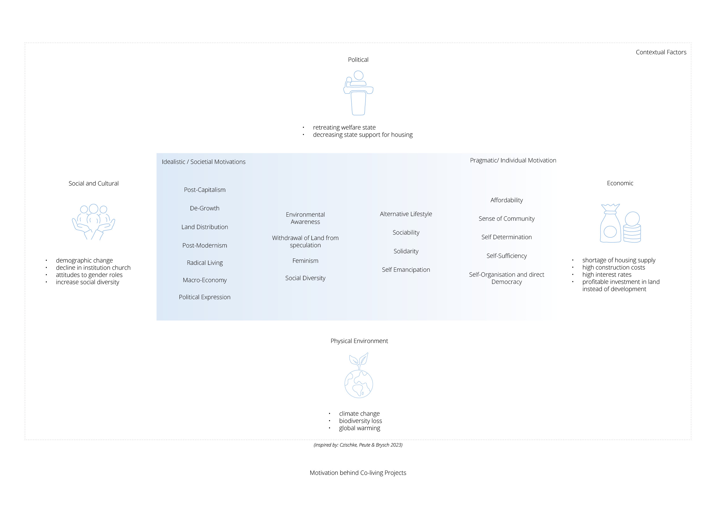 A key focus of my research has been to understand the motivations of residents in collaborative housing projects, because I see that as a fundamental factor determining which legal form, which organisational form and which architectural form is reasonable for the project. I have examined and categorised the various factors driving individuals and families to seek out these living arrangements, including a desire for community engagement, cost-sharing, sustainability and a self-determined way of living for lifestyles out of the norm. Since my following architectural proposal will be in Germany, I have investigated the national legal frameworks for cohousing. This analysis provides insight into which and how these legal arrangements are successfully withdrawing living space form the speculative market and instead ensuring the permanent focus on housing for the common good.